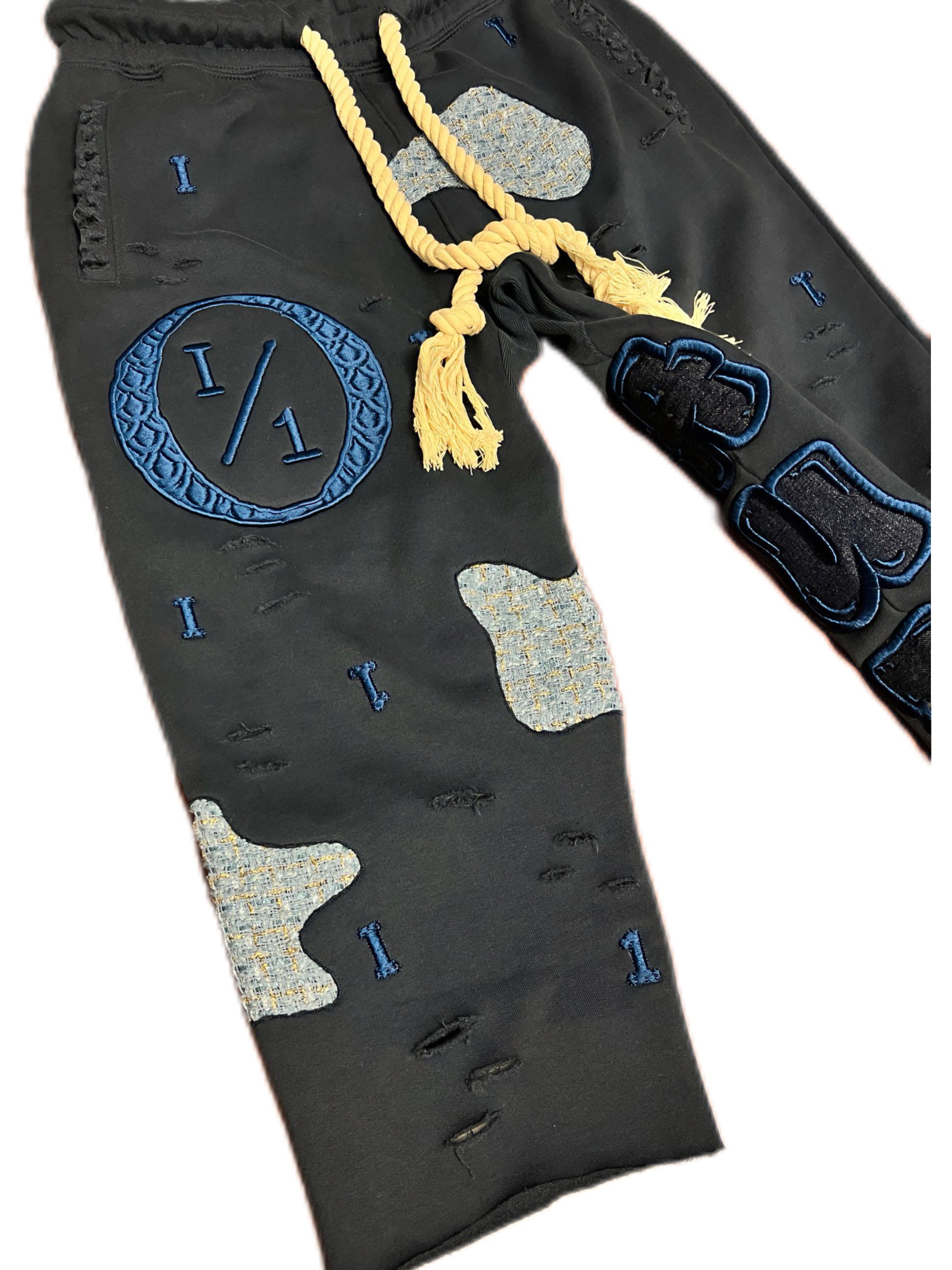 Aura- you’re felt before anything else. Navy braided pattern 1of1 with light blue twill fabric spots; AURA in denim on inner seam and 1 of 1 puffs throughout, SELF in denim fabric, ME af in navy velvet, and spilling distress.