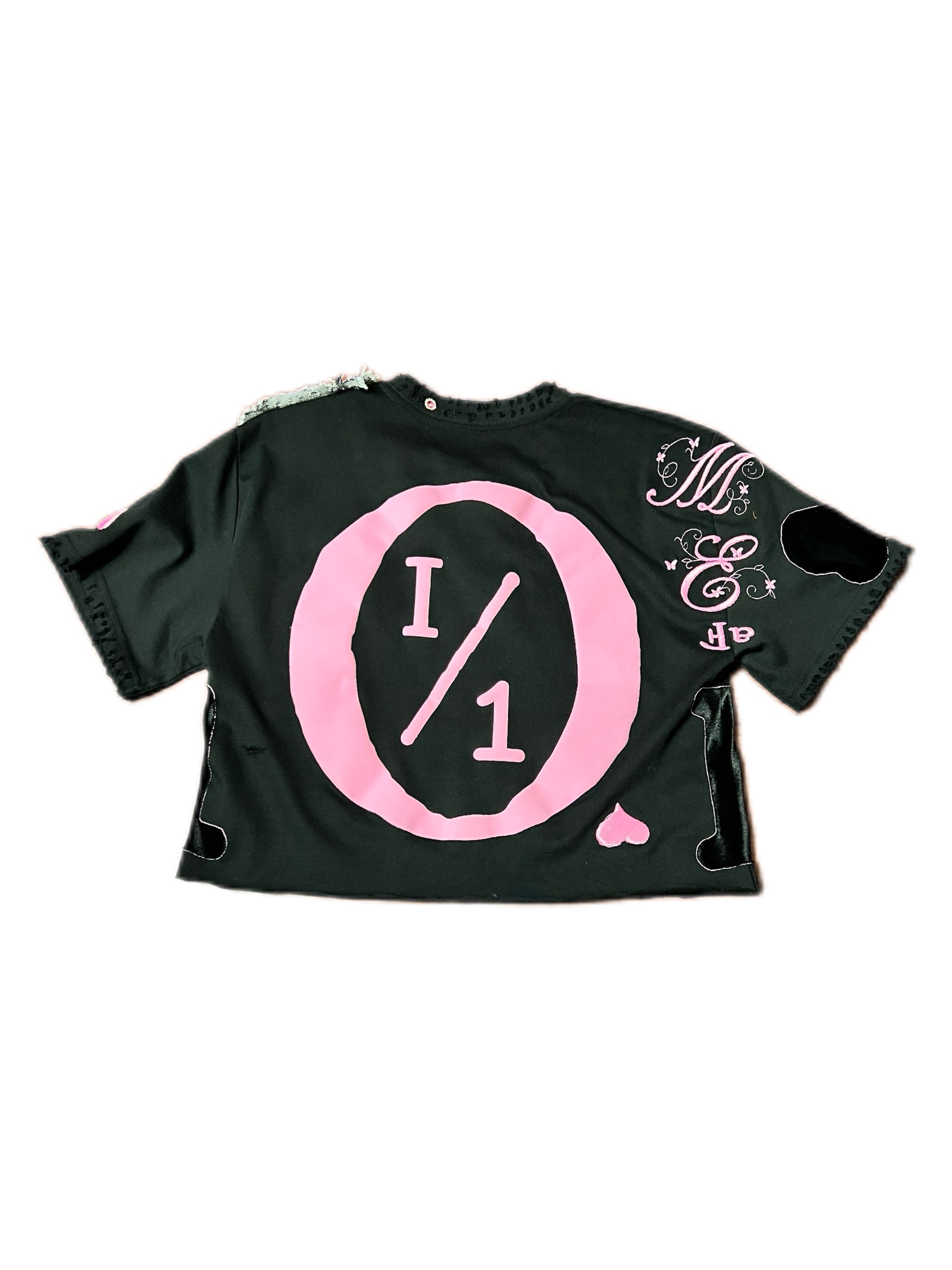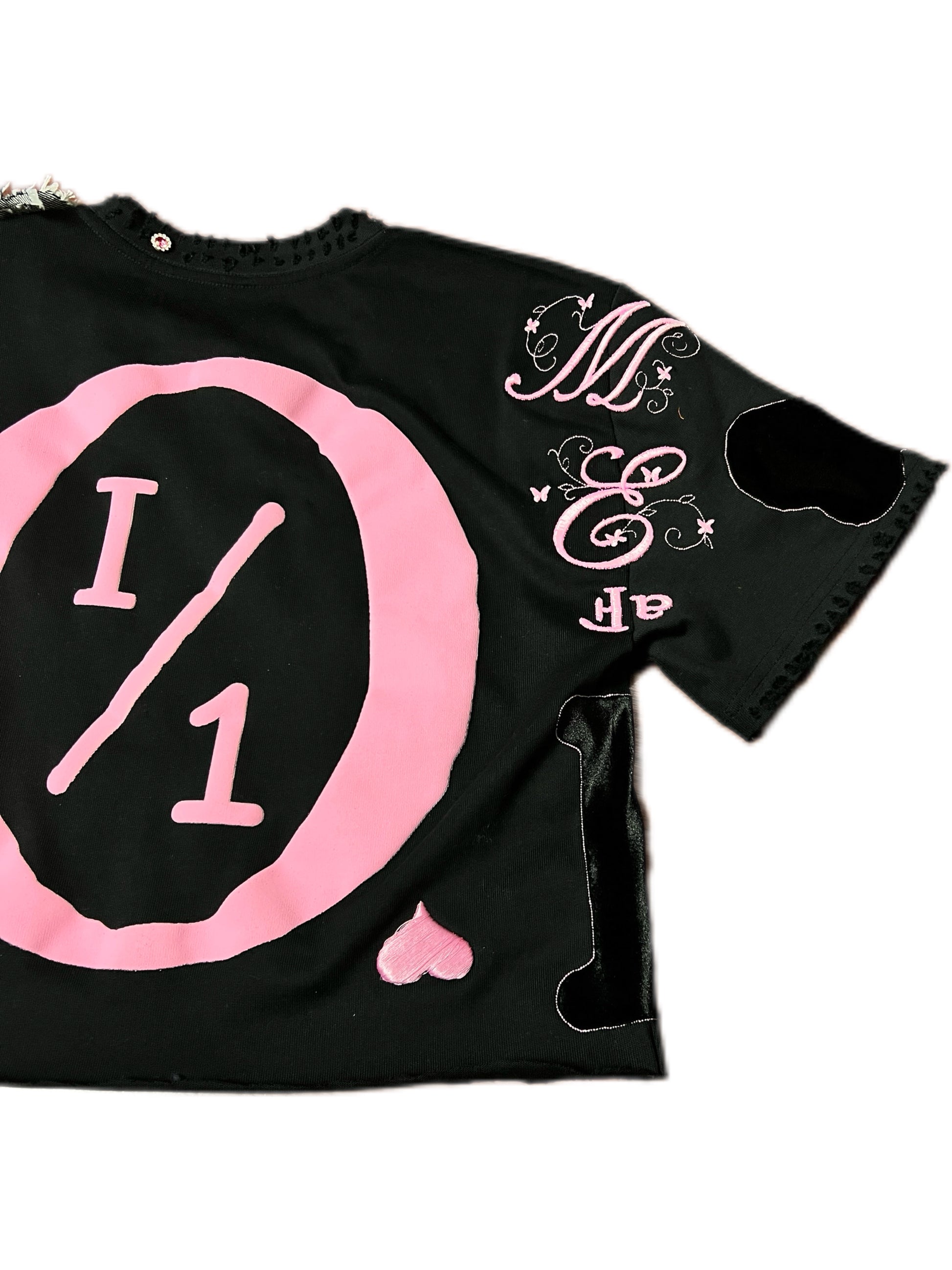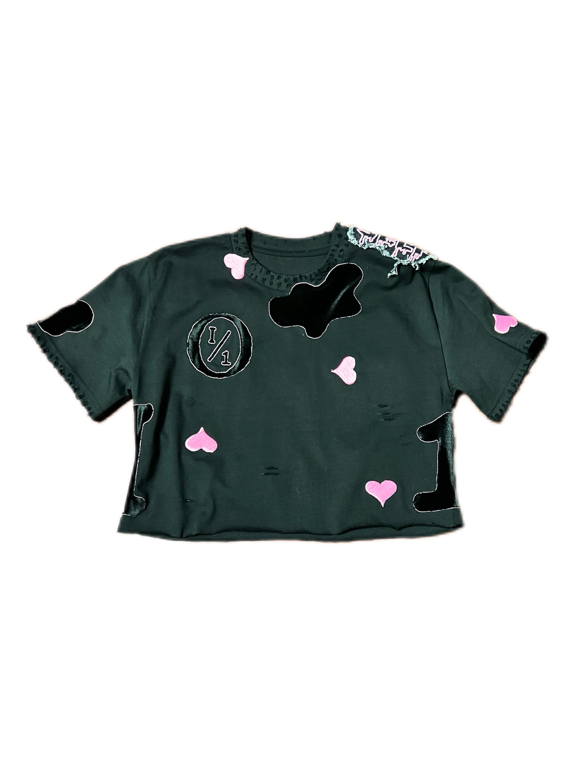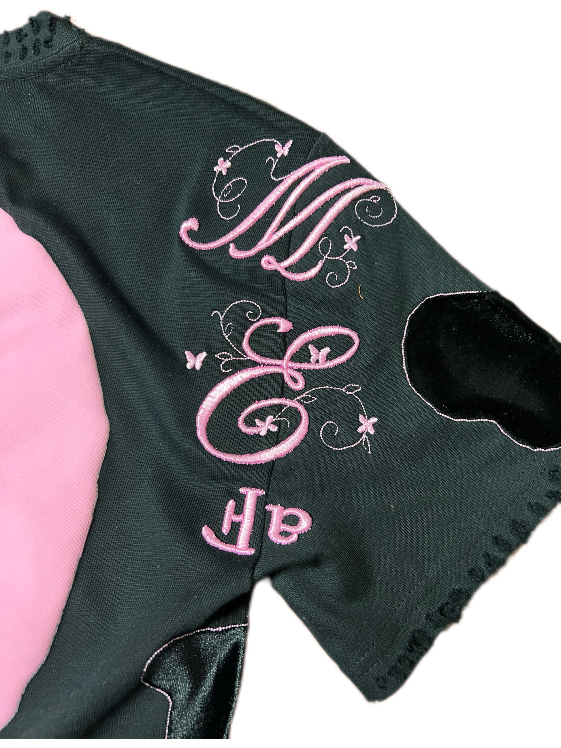 Pink screenprint puff with 3d puff pink hearts embroidered, mixed with black velvet and black denim on shoulder.