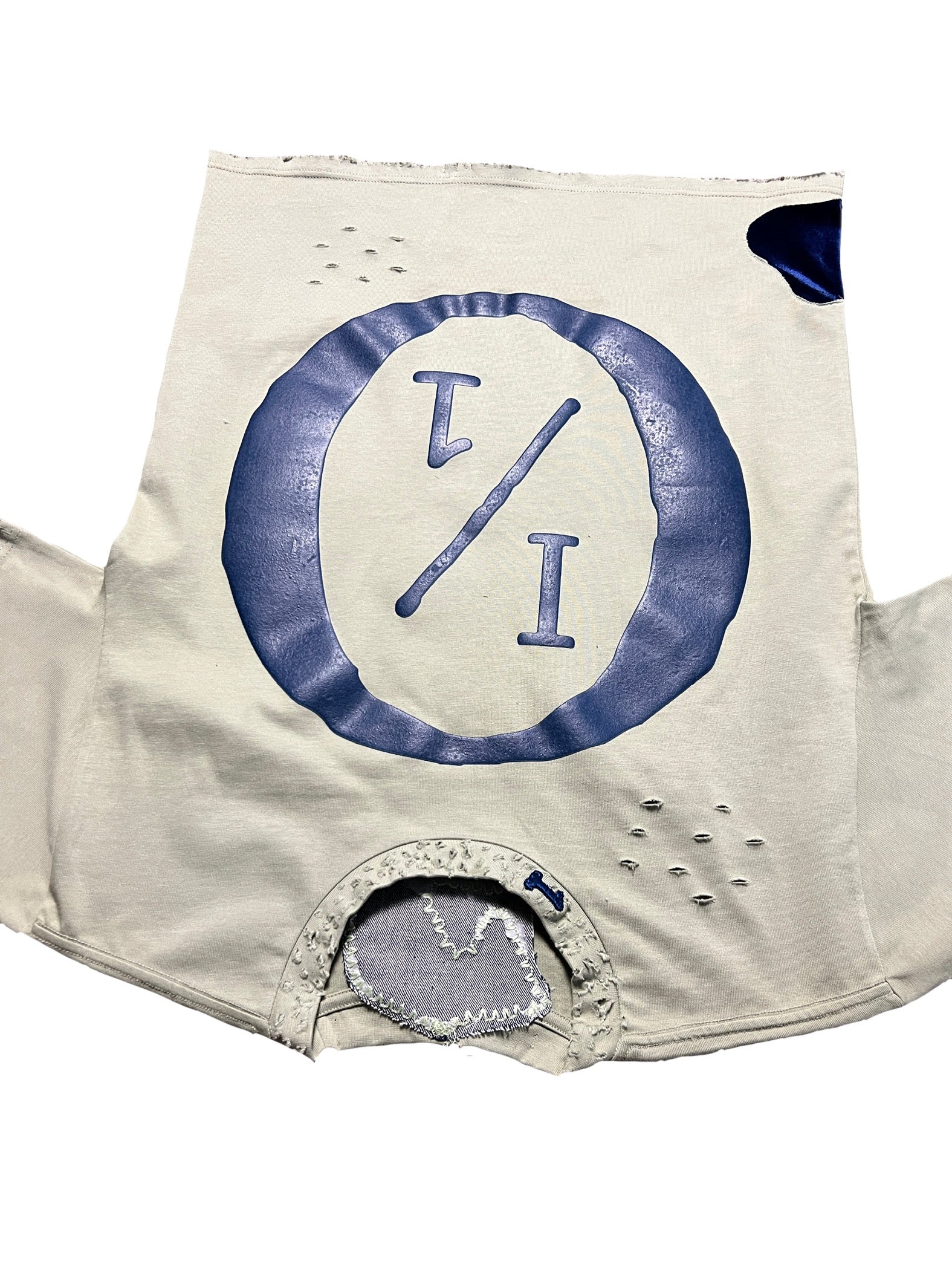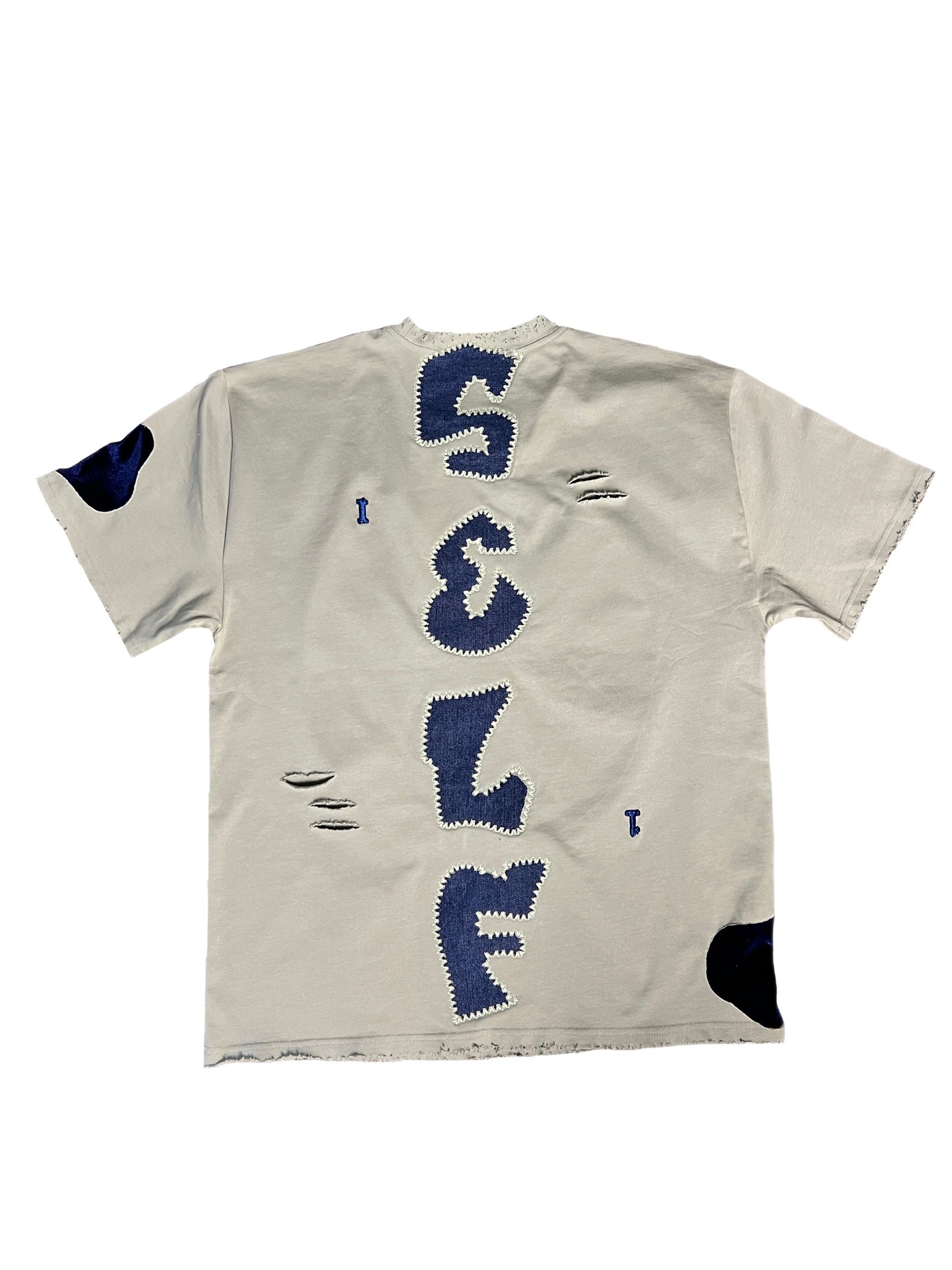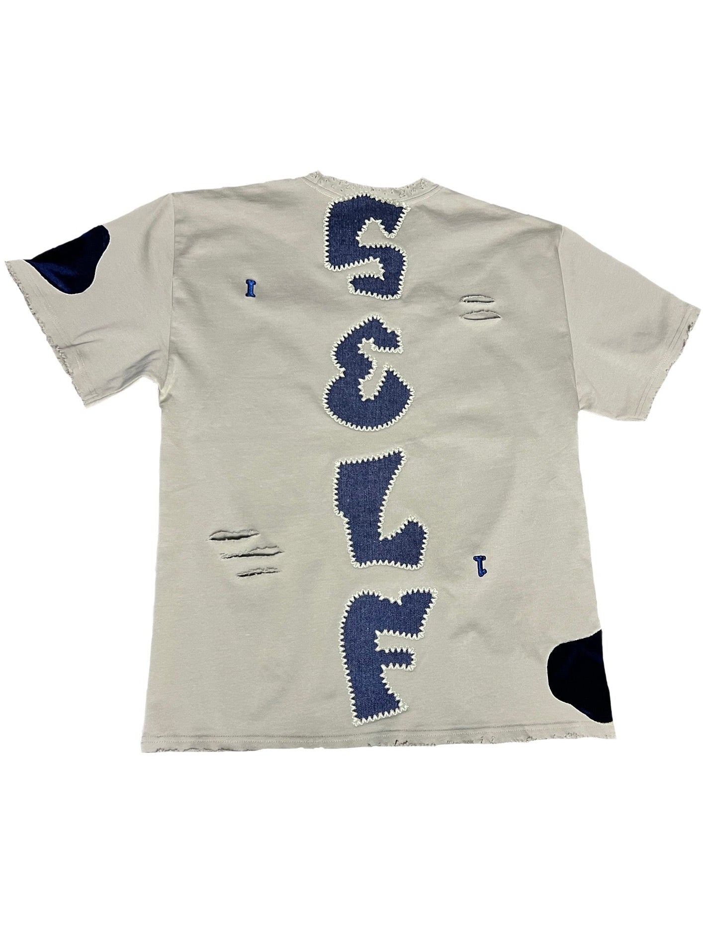 Sage with navy blue puff screenprint 1/1 with SELF in denim fabric, distressed and a 3D puff 1 on the collar and 1/1 3D puff on the back and navy blue velvet fabric on sleeve and opposite bottom.