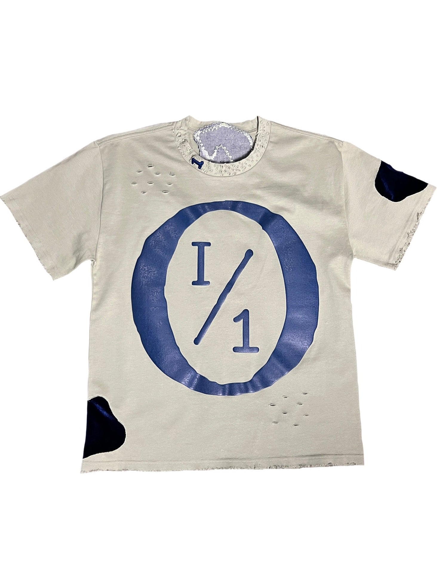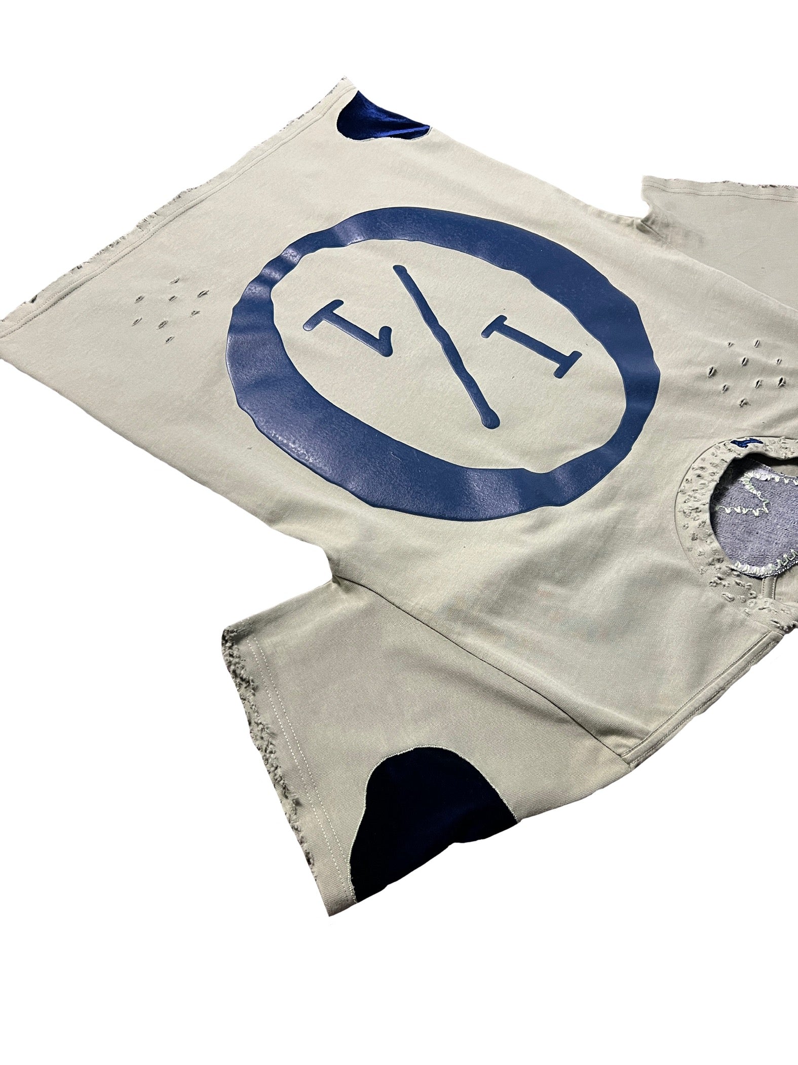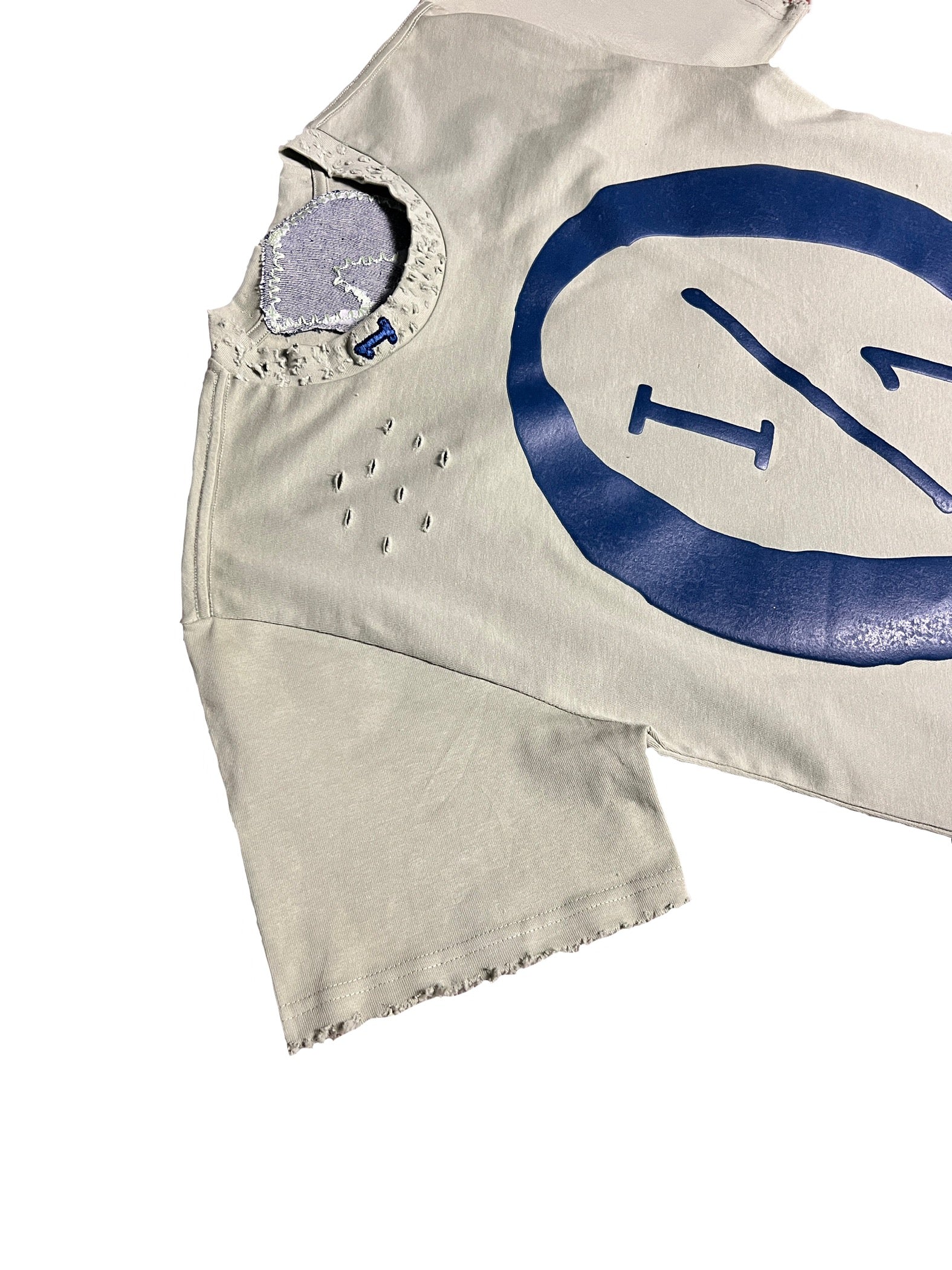 Sage with navy blue puff screenprint 1/1 with SELF in denim fabric, distressed and a 3D puff 1 on the collar and 1/1 3D puff on the back and navy blue velvet fabric on sleeve and opposite bottom.